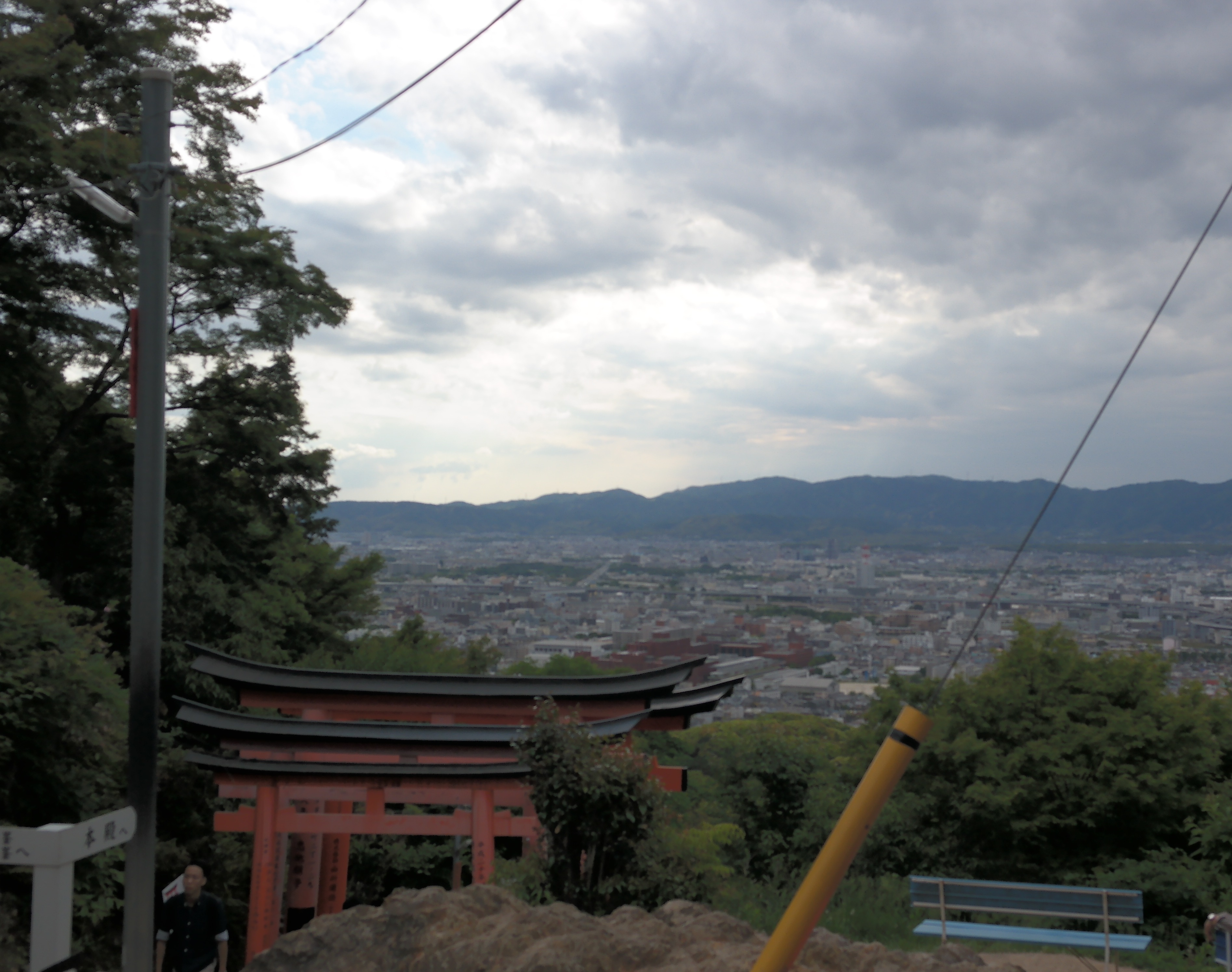К концу подъёма наша гид уже запыхалась и шла не так бодро, как в начале. Пришлось пояснить ей причину нашей бодрости: наш город находится в горах, поэтому мы ещё долго можем подниматься без остановки — мы натренированные 🙂 В качестве награды за упорство и терпение сверху открывается вот такой вид на Киото: